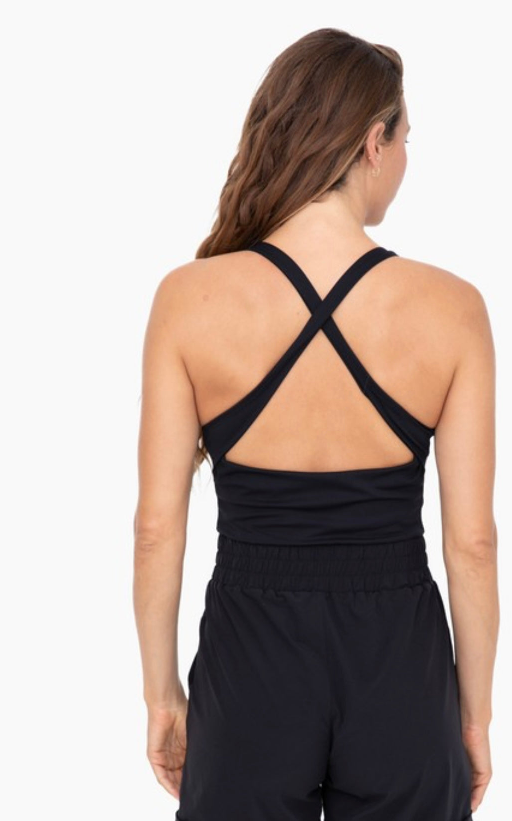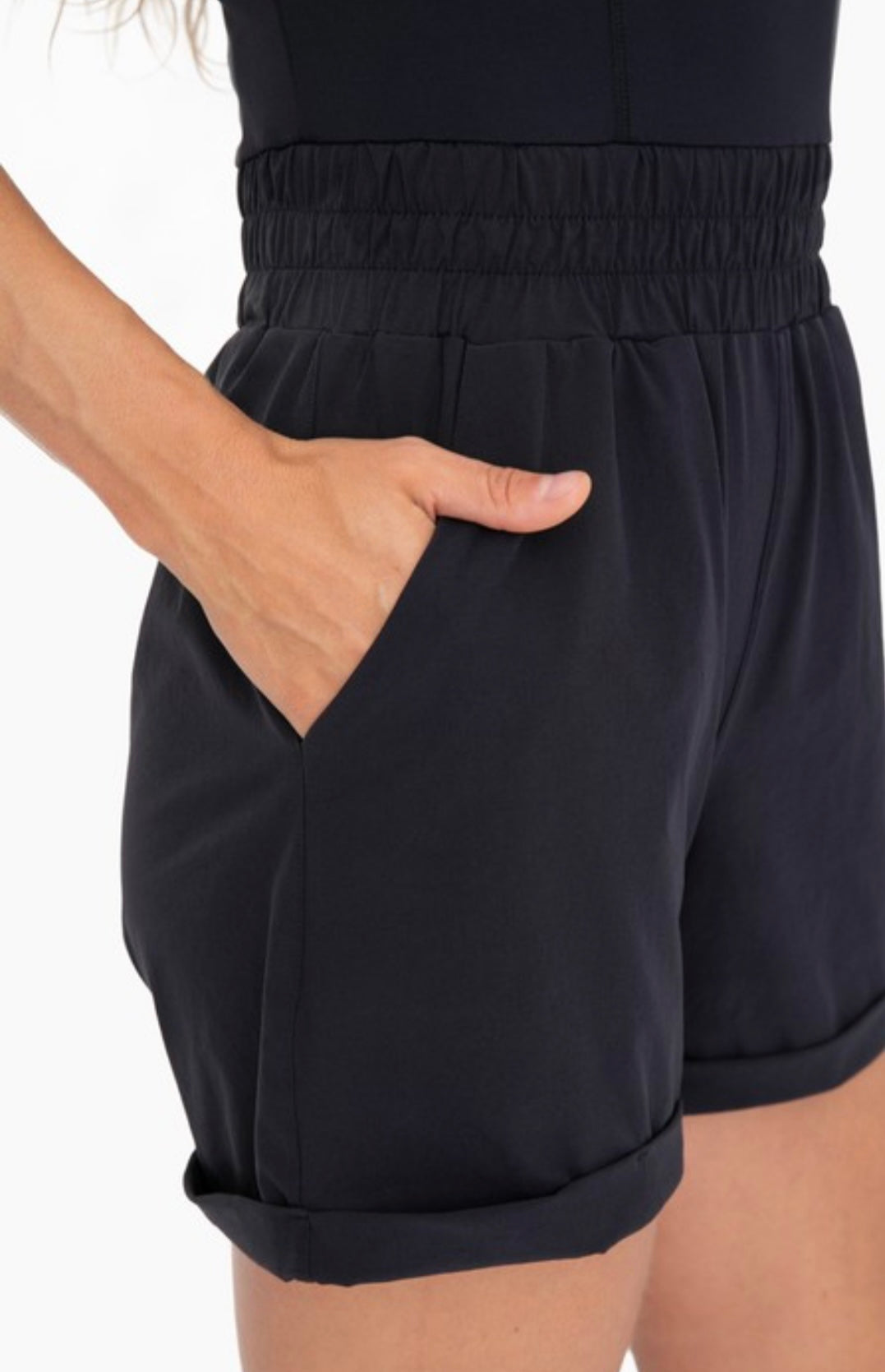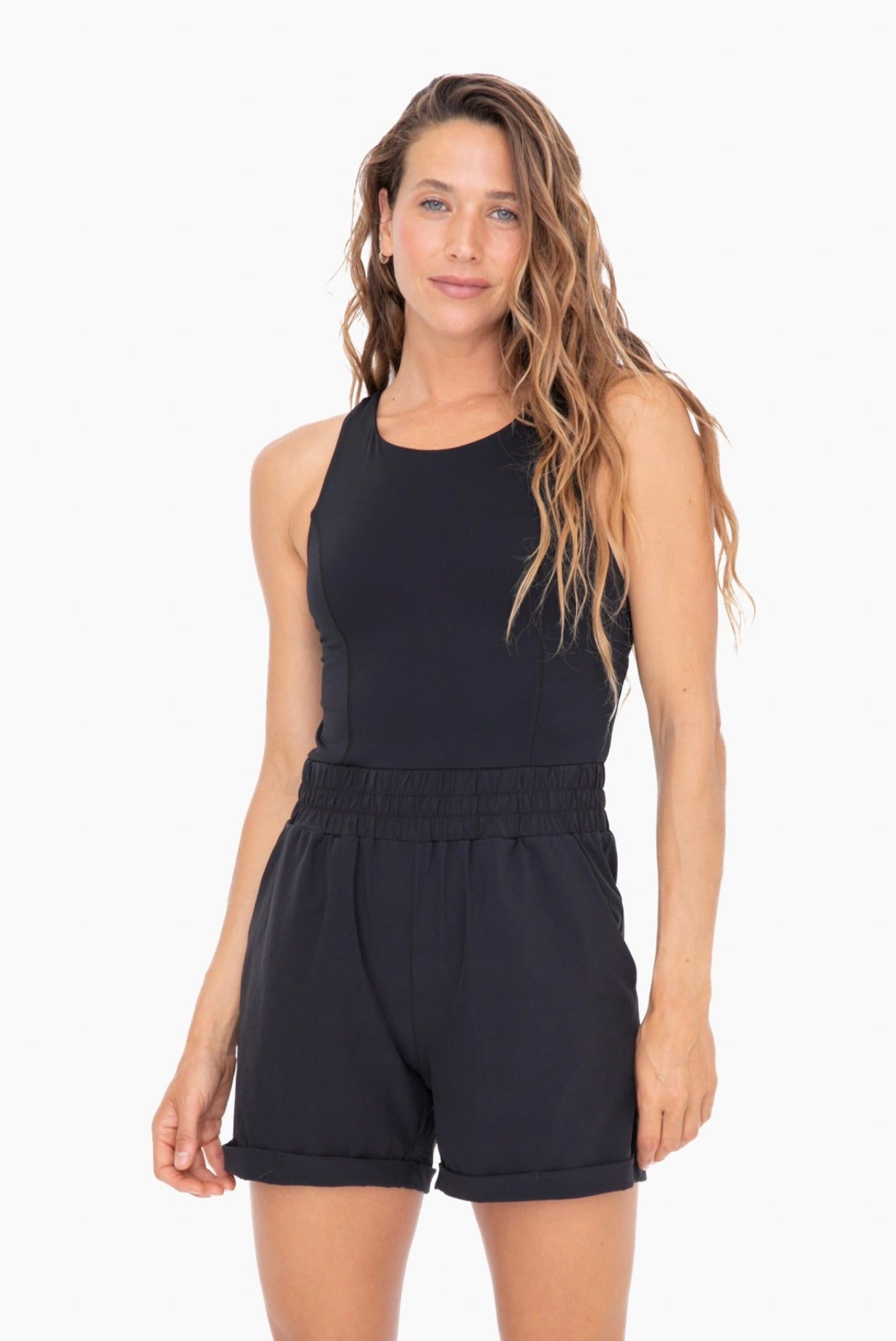 The best solution to that active top riding up or shorts falling down during your workout? Our one and done running shortsie! Our latest active one piece is constructed from a jersey tank with contouring princess seams and thicker straps for support and a stretch woven shorts with slash pockets. It features an elastic waistband and built in bra support with removable pads. Miska is 5'9", a size 4, and is wearing an S 85% recycled nylon 15% spandex Four-way stretch